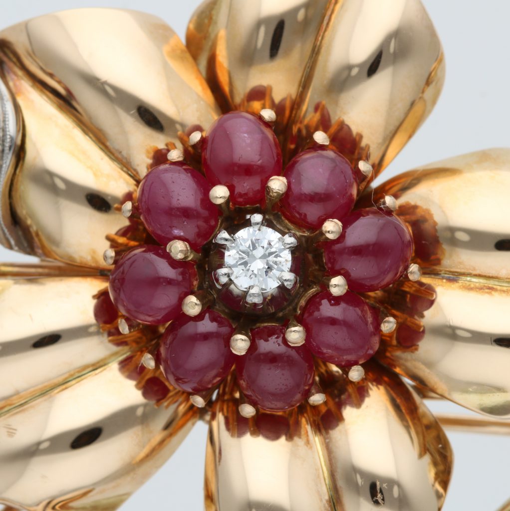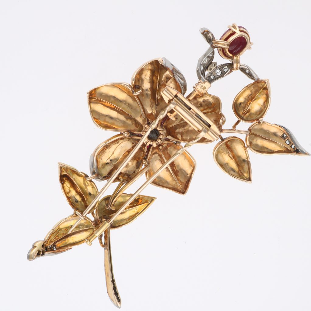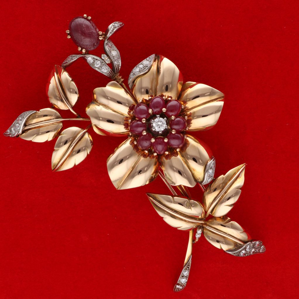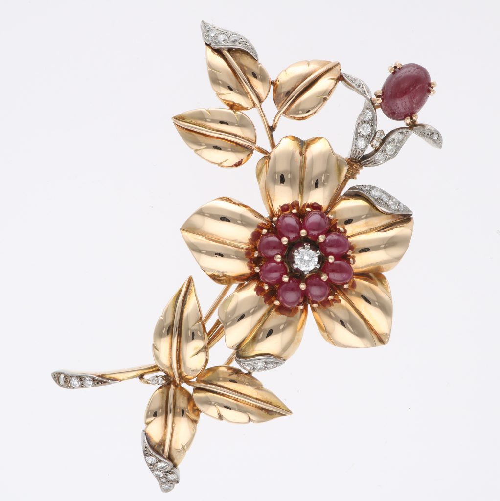 SPILLA IN ORO GIALLO 18K A FORMA DI FIORE DEL 1940 ORNATA CON 9 RUBINI DI 4 CT TOTALE E 34 DIAMANTI DI 1.7 CT TOTALE. PESO DELLA SPILLA 45 GRAMMI